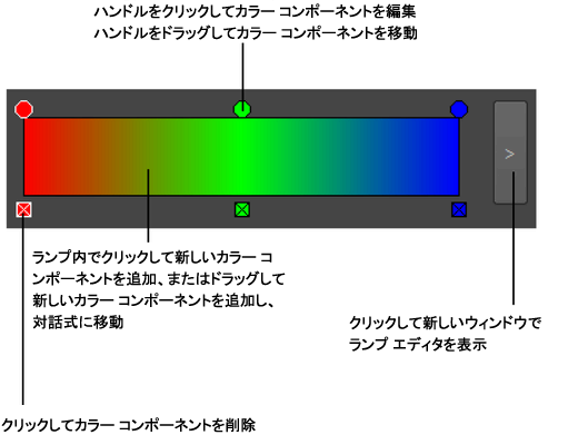 ランプ内の各カラー コンポーネントの上部には円形のカラー ハンドルが表示され、下部には正方形のカラー アイコンが表示されます。アクティブなカラーは、そのカラー ハンドルとカラー アイコンの回りに白い境界が表示されます。また、ランプの右側の矢印をクリックして、より大きなサイズ変更可能なウィンドウにランプ エディタを開くことができます。