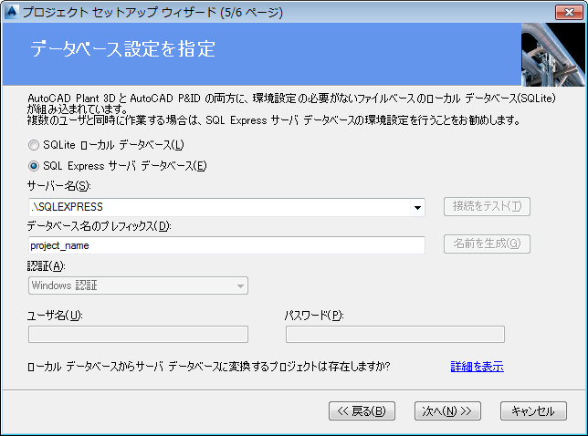 - [プロジェクト セットアップ ウィザード(5/6 ページ)]で、既定のデータベースを選択して[次へ]をクリックするか、SQL Express サーバ データベースを選択します。サーバ データベースを選択した場合は、次の操作をします。