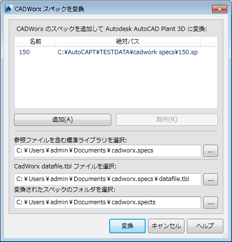 [CADWorx スペックを変換]ダイアログ ボックスで、[追加]をクリックします。
