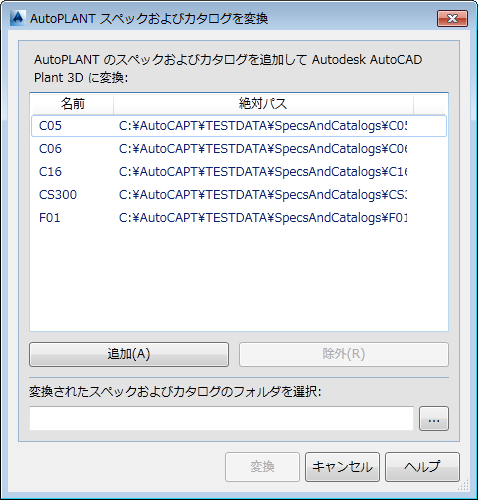 [AutoPLANT スペックおよびカタログを変換]ダイアログ ボックスで[追加]をクリックします。