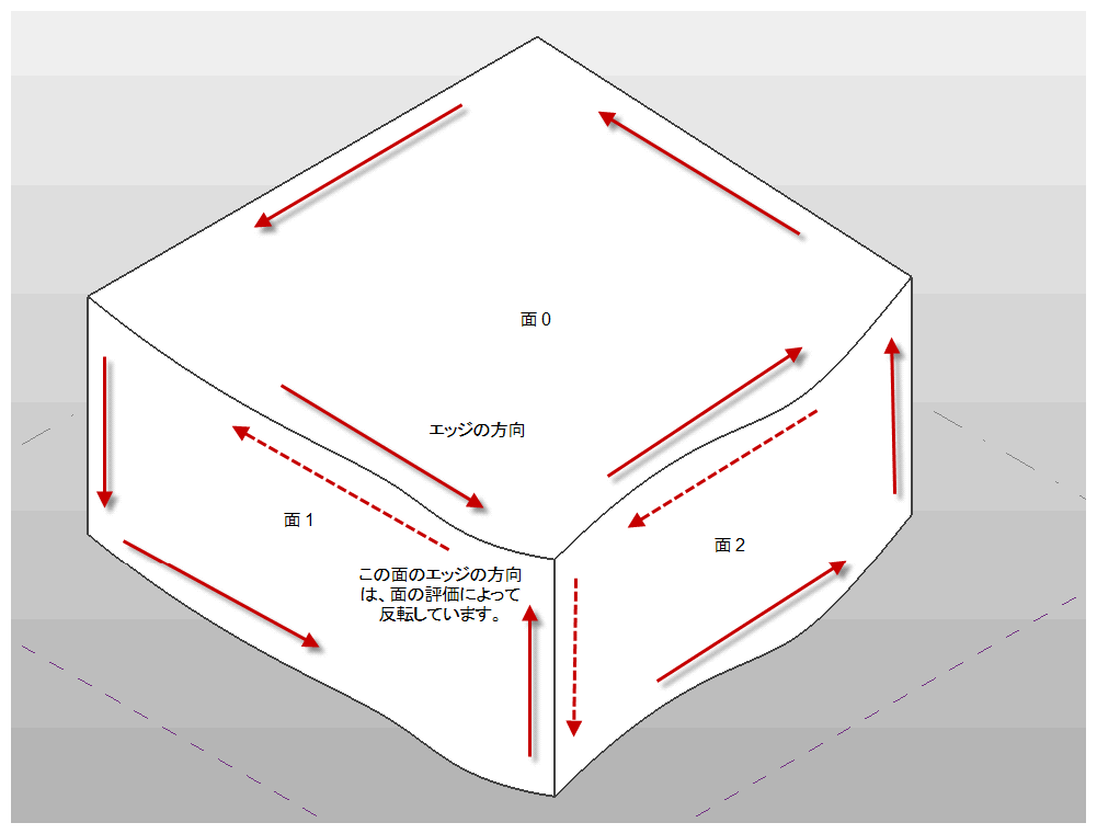 方向は、通常、最初の面(Revit が特定のエッジを認識した任意の面の最初の表現)では時計回りです。ただし、2 つの異なる面が 1 つの特定のエッジで一致し、どちらの面を対象としているかに関わらずエッジは同じパラメトリック方向を持つため、場合によっては、特定の面上のエッジの方向を判断する必要があります。