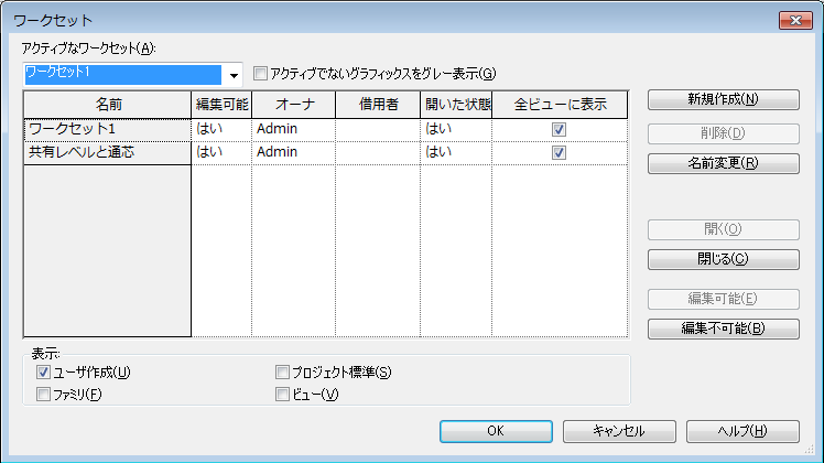 ワークシェアリングを有効にすると、既定のワークセットが複数作成されます(2 つの既定のユーザ作成ワークセット、ならびにプロジェクト、プロジェクト標準、およびプロジェクト ビューでロードされたファミリ用のワークセット)。