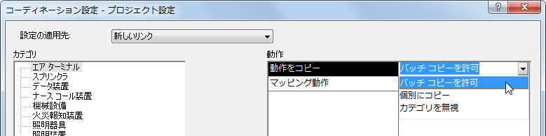 リンク モデルから MEP プロジェクトに器具をコピーする前またはコピー実行時に、コーディネーション設定を指定するダイアログで各器具カテゴリのコピー動作を指定します。
