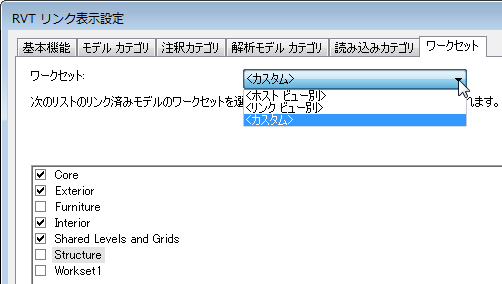 ホスト モデルの[RVT リンク表示設定]ダイアログの[ワークセット]タブを使用します。このタブでは、ホスト モデルのビューに表示する特定のワークセットを選択できます。