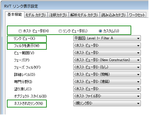 ホスト ビューでリンクされたモデルに対するフィルタの使用をコントロールするには、[RVT リンク表示設定]ダイアログの設定を使用します。