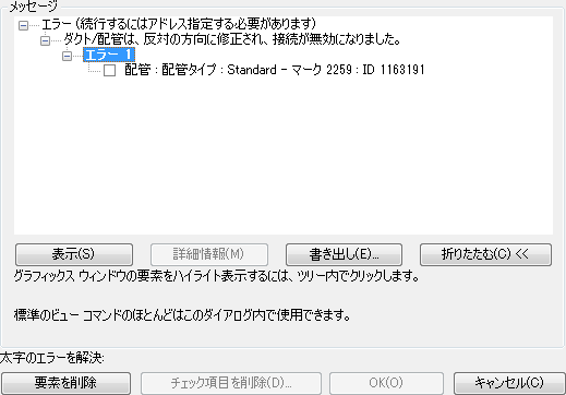 - エラーの見出し(エラー 1 など)を選択します。該当するエラーに関連付けられているすべての要素が作図領域で選択されます。