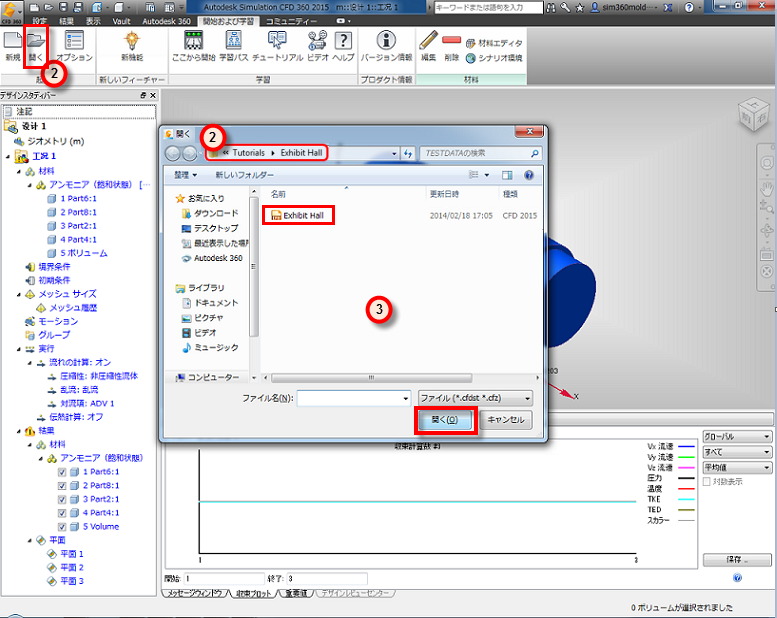2. [起動]パネルで[開く]をクリックし、C:¥ProgramData¥Autodesk¥Simulation CFD <バージョン>¥Tutorials¥Exhibit Hall に移動します。