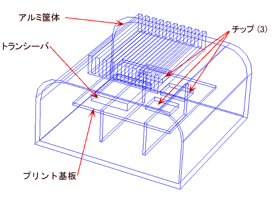 アルミ筐体には、複数の発熱部品が格納されています。このモジュールの周囲には、空気温度勾配により発生する重力と密度の変化によって空気の流れが発生します(これは、浮力と呼ばれます)。筐体の外側のフィンにより、周囲の大気への放熱が行われます。