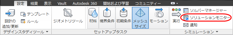 3. ソリューション モニタを開くには、[設定]タブ > [シミュレーション]パネル > [ソリューション モニタ]の順にクリックします。