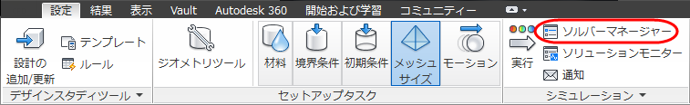 1. ソルバ マネージャを開くには、[セットアップ]タブ > [シミュレーション]パネル > [ソルバ マネージャ]の順にクリックします。