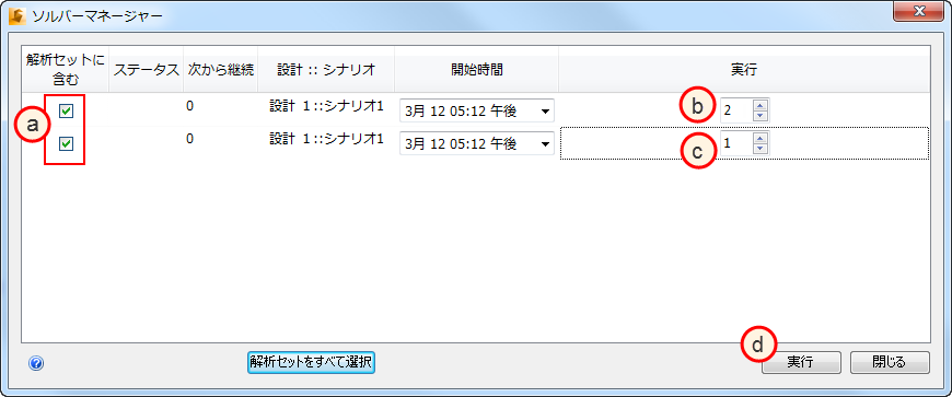このステップでは、両方のシナリオの流れを解析します。最初のモデル終了後、2つ目のモデルを手動で実行する代わりに、ソルバーマネージャを使って自動的に連続して実行します。