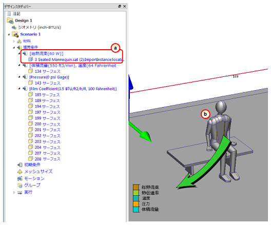 8. 境界条件が利用者に正しく適用されていることを確認するには、デザイン スタディ バーと人間の部品の色付きストライプを調べます。