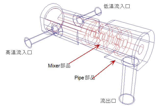 このチュートリアルでは、簡略化された水道蛇口内部の流れについて学習します。高温の水と低温の水が合流し、混ざり合った後に出口から出るモデルです。