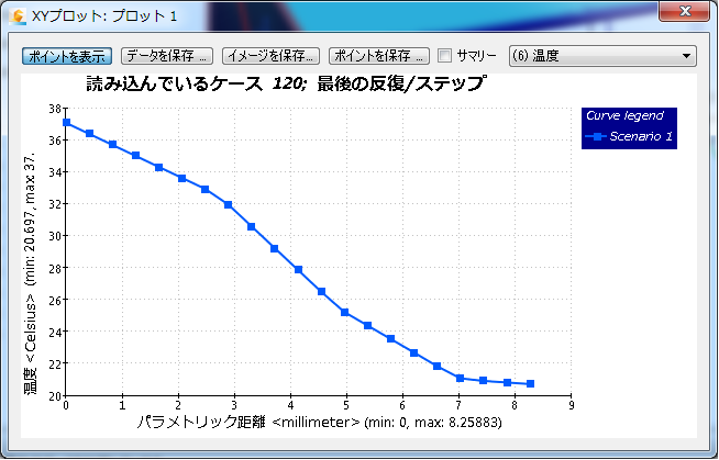 大きな温度勾配はユーザーにとって大変不快ですし、熱い湯で火傷をする危険もあります。このステップでは、出口の温度のXYプロットを作成します。これにより、出口の温度のばらつきを明確に、グラフィカルに評価することができます。