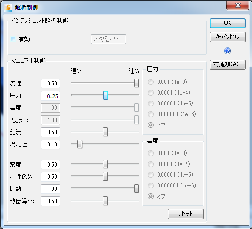 [解析制御]ボタンをクリックし、[圧力]スライダを 0.25 に設定します。