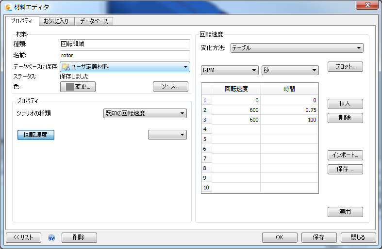 回転速度単位 = RPM、時間単位 = 秒(s)
