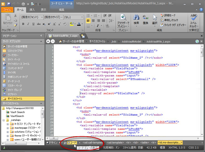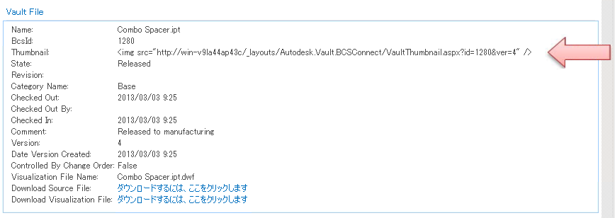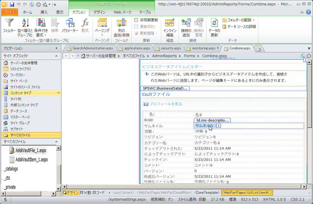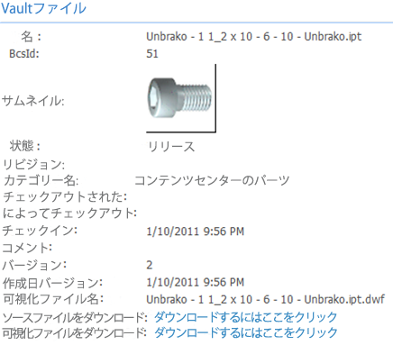 AdskVaultFile (以下参照)で Create/Upgrade が呼び出されると、プロファイル ページが上書きされ、サムネイルが正しく表示されない場合があります。サムネイルの正しい表示を復元するには、プロファイル ページ XSL を手動で更新する必要があります。更新をアーカイブする方法はいくつかあります。すべての方法では、プロファイル ページおよび XSL 構成に精通している必要があります。次に説明するプロセスでは、Microsoft からオンラインで入手できる Microsoft SharePoint Designer 2010 が必要です。