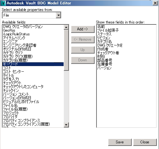 配置フォルダにある Autodesk.BDCModelEditor アプリケーションを使用すると、SharePoint に開示される Vault プロパティのリストを修正することができます。すべての Vault ユーザ定義プロパティを SharePoint に対して開示することができます。リストおよびプロファイル ページの既定のプロパティおよび表示設定を次に占めします。