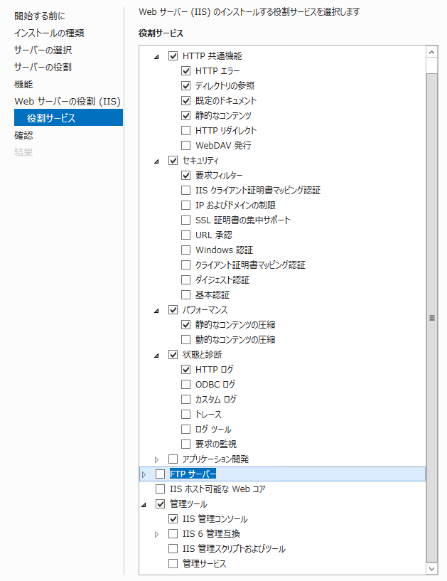 - 左側の[サーバーの役割]を選択し、[役割]リストの[Web サーバー(IIS)]チェック ボックスをオンにします。