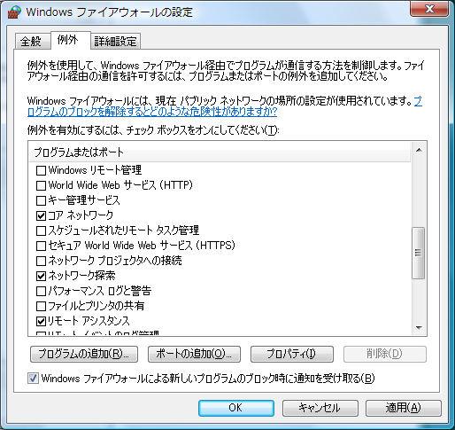 - [例外]タブで、既定の Web ポートが、ファイアウォールでブロックされていないプログラムおよびサービスに一覧表示されていることを確認します。一覧表示されていない場合は、[ポートの追加]をクリックします。