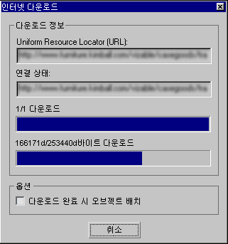 자산 브라우저를 사용하여 World Wide Web에서 형상 파일을 드래그하면 인터넷 다운로드 대화상자가 나타납니다. 이 대화상자가 화면에 표시되어 있는 시간은 다운로드하는 파일의 크기에 따라 달라집니다.