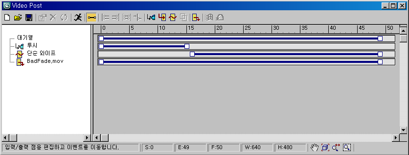 이 번에도 역시 대기열의 이벤트는 모두 올바릅니다. 하지만 이 문제에서는 대기열의 이벤트 순서가 잘못되었습니다. 이 문제는 흔히 다른 이벤트를 추가하는 중에 이벤트를 선택하는 경우에 발생합니다. 이 경우에는 렌즈 효과 글로우 및 출력 이벤트가 추가될 때 투시 이벤트가 선택되었습니다.