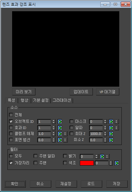 이미지 필터 이벤트 드롭다운 리스트에서 렌즈 효과 강조 표시를 선택하고 설정을 클릭하면 3ds Max에서 강조 표시 대화상자가 열립니다.