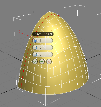 3ds Max에서 선택한 가장자리 주위에 단일 루프 가장자리가 그려집니다. 또한 연결 도구에 대한 "캐디" 컨트롤이 표시됩니다.