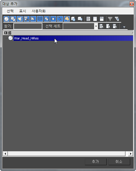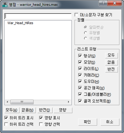 병합을 선택한 다음 파일 대화상자에서 장면 파일이 포함된 폴더를 탐색합니다. 고해상도 모델 warrior_headhires.max가 포함된 장면을 선택한 다음 열기를 클릭합니다. 3ds Max에 병합 대화상자가 열립니다.