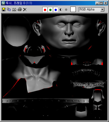 렌더링된 프레임에 고해상도 모델의 둘러싸기 해제된 분산 맵이 표시됩니다. 분류된 빨간색 패치가 표시되어 범프 맵 투영 광선이 기본 형상을 제대로 캡처하지 못한 부분을 나타냅니다. 이는 투영 수정자에서 만든 케이지가 이러한 부분의 고해상도 모델을 완전히 포함하지 못하기 때문입니다.