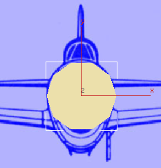(선택 및 이동)을 켭니다. 왼쪽 뷰포트에서 원통을 이동하여 비행기 이미지의 중심에 배치되도록 합니다. 맨 위 뷰포트에서 앞쪽으로 이동하여 뒷면 가장자리가 엔진 커버의 뒷면 가장자리와 일치되도록 합니다.