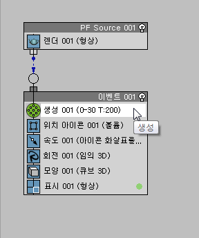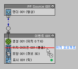 - "기지"는 파티클 뷰 창의 아래쪽에 나타나는 연산자 및 테스트 리스트입니다. 기지에서 위치 오브젝트 연산자를 드래그하고 Event 001에서 위치 아이콘 001 연산자 바로 위에 드롭합니다.