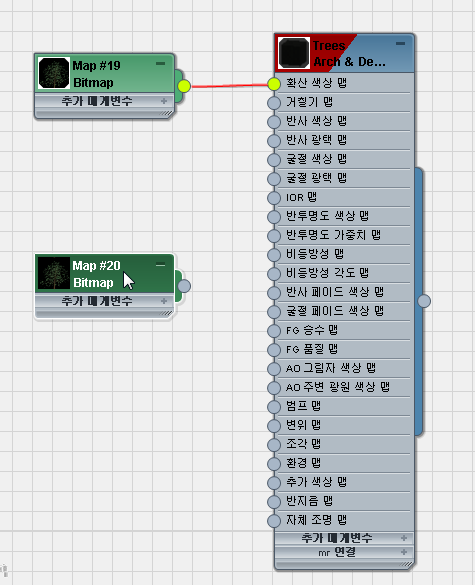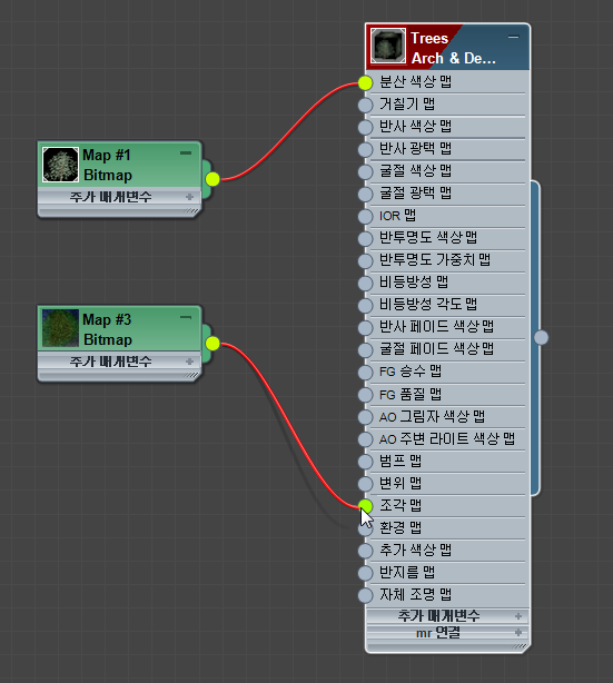 - 나무 재질의 분산 색상 맵 소켓에 새 비트맵 노드를 와이어링합니다.