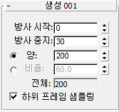 파티클 뷰 오른쪽에 있는 생성 001 롤아웃에는 파티클 만들기와 관련된 매개변수가 표시됩니다. 방사 시작 및 방사 중지 스피너는 파티클 생성이 프레임 0에서 시작되고 프레임 30에서 끝남을 나타냅니다. 양 스피너는 시스템에 의해 200개 파티클이 생성됨을 나타냅니다.