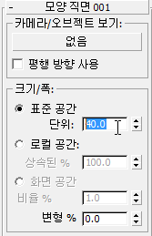 - 모양 직면 001 연산자를 클릭하여 강조 표시합니다. 크기/폭 그룹에서 표준 공간이 선택되어 있는지 확인한 다음 단위 값을 40.0으로 변경하고