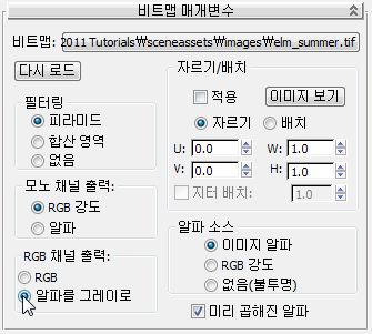 - 비트맵 매개변수 롤아웃의 모노 채널 출력 그룹에서 알파를 선택한 다음 RGB 채널 출력 그룹에서 알파를 그레이로를 선택합니다.