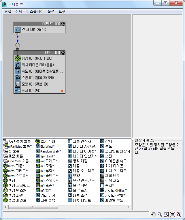 파티클 뷰에서는 파티클 시스템을 관리하며 장면에서 사라질 때 까지 파티클 모양과 행동에 영향을 주는 이벤트뿐만 아니라 파티클 소스와 매개변수를 시각화할 수 있습니다.