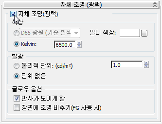 - 자체 발광(광택) 롤아웃에서 자체 발광을 켭니다.