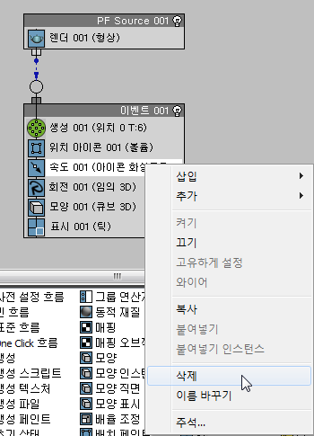 - 파티클 나무가 이동하지 않도록 하려고 하므로 파티클 뷰에서 속도 001 연산자를 클릭하여 강조 표시한 다음 마우스 오른쪽 버튼을 클릭하여 삭제를 선택합니다.