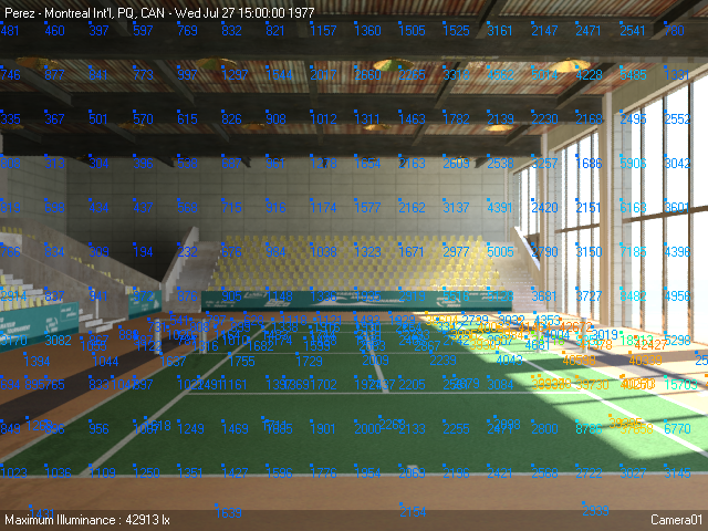 두 번째 렌더링된 프레임에는 조명 분석에서 파생된 조명 데이터 레이어가 들어 있습니다. 라이트 미터 샘플 점에서 생성된 값은 물론 조명 값이 그리드에 포함되어 있으므로 숫자가 조밀하고 읽기가 어렵습니다.