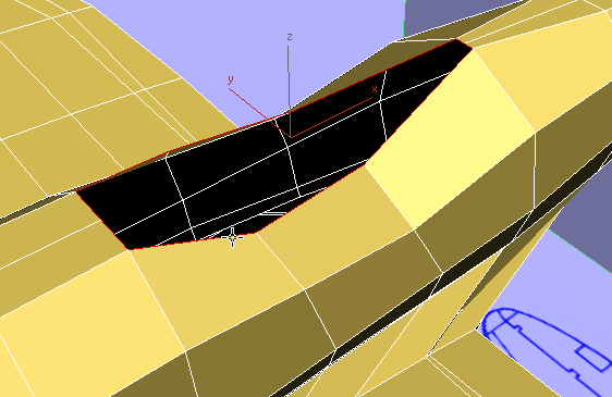 이제 P-47 기체에는 조종석 모양의 구멍이 있습니다. 모델을 다시 연속적인 표면으로 만들려면 면을 추가하여 구멍 내부를 구성합니다.