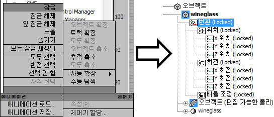 +Z)하여 변환 트랙을 잠금 상태로 복원합니다. 그러면 변환 트랙과 모든 하위 트랙이 잠금 해제됩니다. 이제 원하는 경우 포도주 잔을 변환할 수 있습니다.