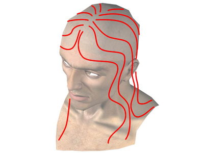 - 머리 왼쪽에서 정수리부터 오른쪽 어깨 방향으로 첫 번째 스플라인을 그린 다음 마우스 오른쪽 버튼을 클릭하여 스플라인 만들기를 종료합니다.
