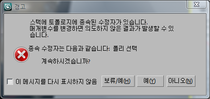 이 자습서에서 수행하는 편집 작업에 대해서는 예를 클릭하여 작업을 계속 진행하는 것이 안전합니다. 예를 클릭하기 전에 이 메시지를 다시 표시하지 않음을 설정할 수도 있습니다. 그러면 이 경고 표시가 비활성화되는데 이 자습서뿐만 아니라 향후 모든 3ds Max 세션에서 비활성화됩니다. 이 옵션은 사용자가 원하는 대로 선택할 수 있지만 이 자습서의 나머지 부분에서는 경고 대화상자에 대해 다시 언급하지 않습니다.