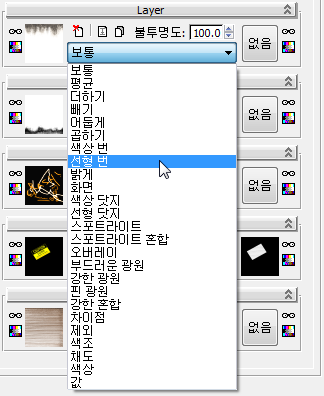 선형 번은 맨 위 레이어의 픽셀 색상을 기본 레이어의 색상과 결합합니다. 레이어 5 색상이 어두울 수록 효과는 커집니다. 결과적으로 기본 혼합이 어무 어둡습니다.