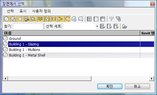 - H 키를 누르고 장면에서 선택 대화상자에서 Building 1 - Glazing 오브젝트를 강조 표시한 다음 확인을 클릭합니다.