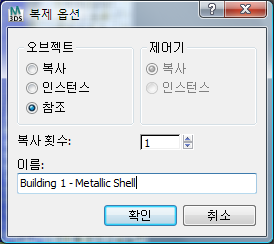 오브젝트 그룹에서 참조를 선택하고 오브젝트의 이름을 Building 1 - Metallic Shell로 변경합니다. 확인을 클릭합니다.