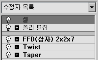 수정 패널의 수정자 스택에서 각 수정자 왼쪽에 있는