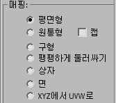 (원통 맵) 버튼은 사람의 팔이나 가로등 기둥과 같은 원통형 오브젝트에 재질을 매핑하는 데 사용되는 컨트롤을 표시합니다. 다른 옵션은 보다 특수한 목적을 가지고 있습니다. 예를 들어 벗기기 롤아웃
