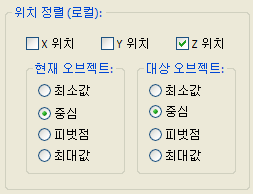 위치 정렬(로컬) 그룹에서 X 위치와 Y 위치를 끄고 Z 위치를 켠 다음 현재 오브젝트 및 대상 오브젝트 하위 그룹 모두에서 중심을 선택합니다. 확인을 클릭합니다.